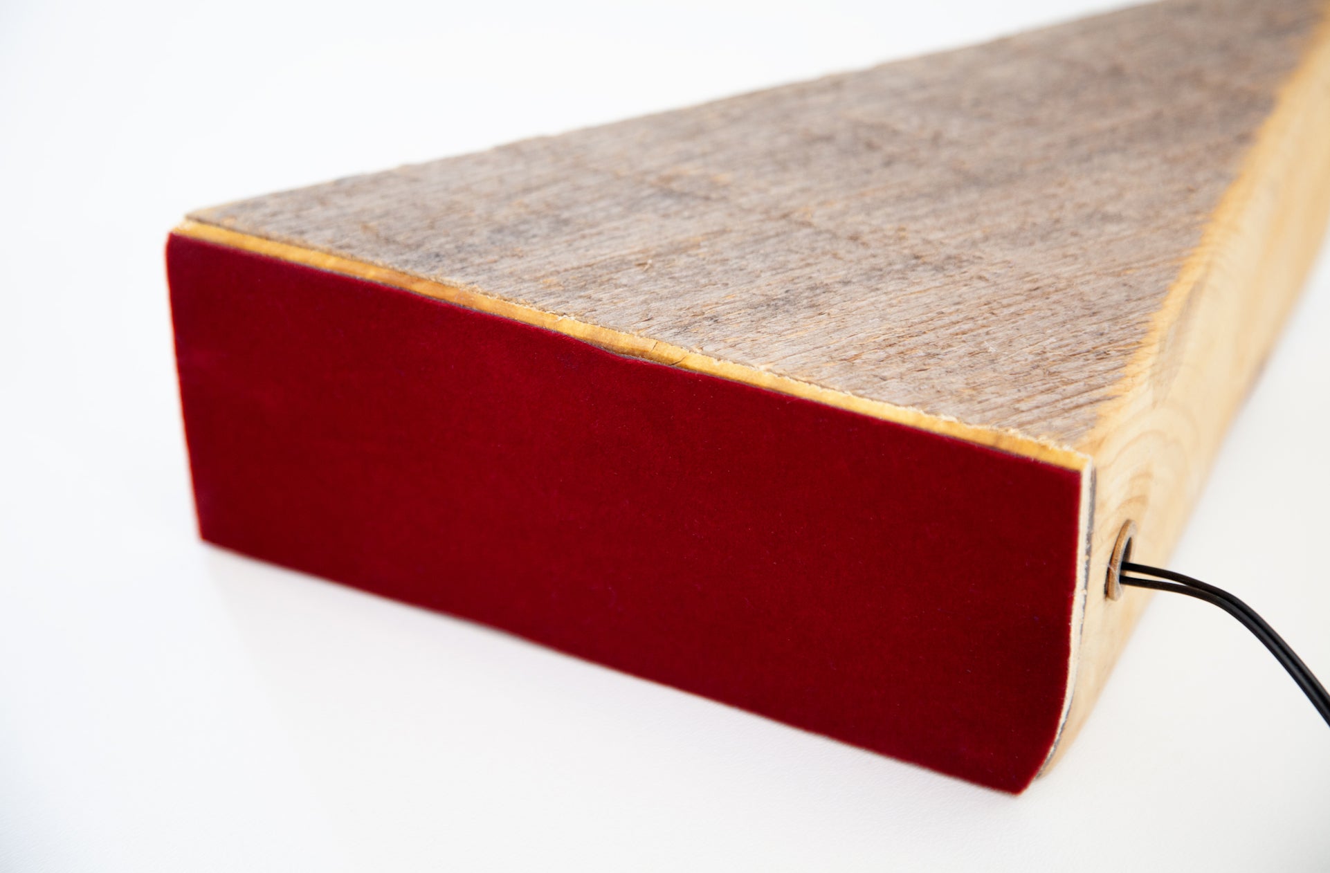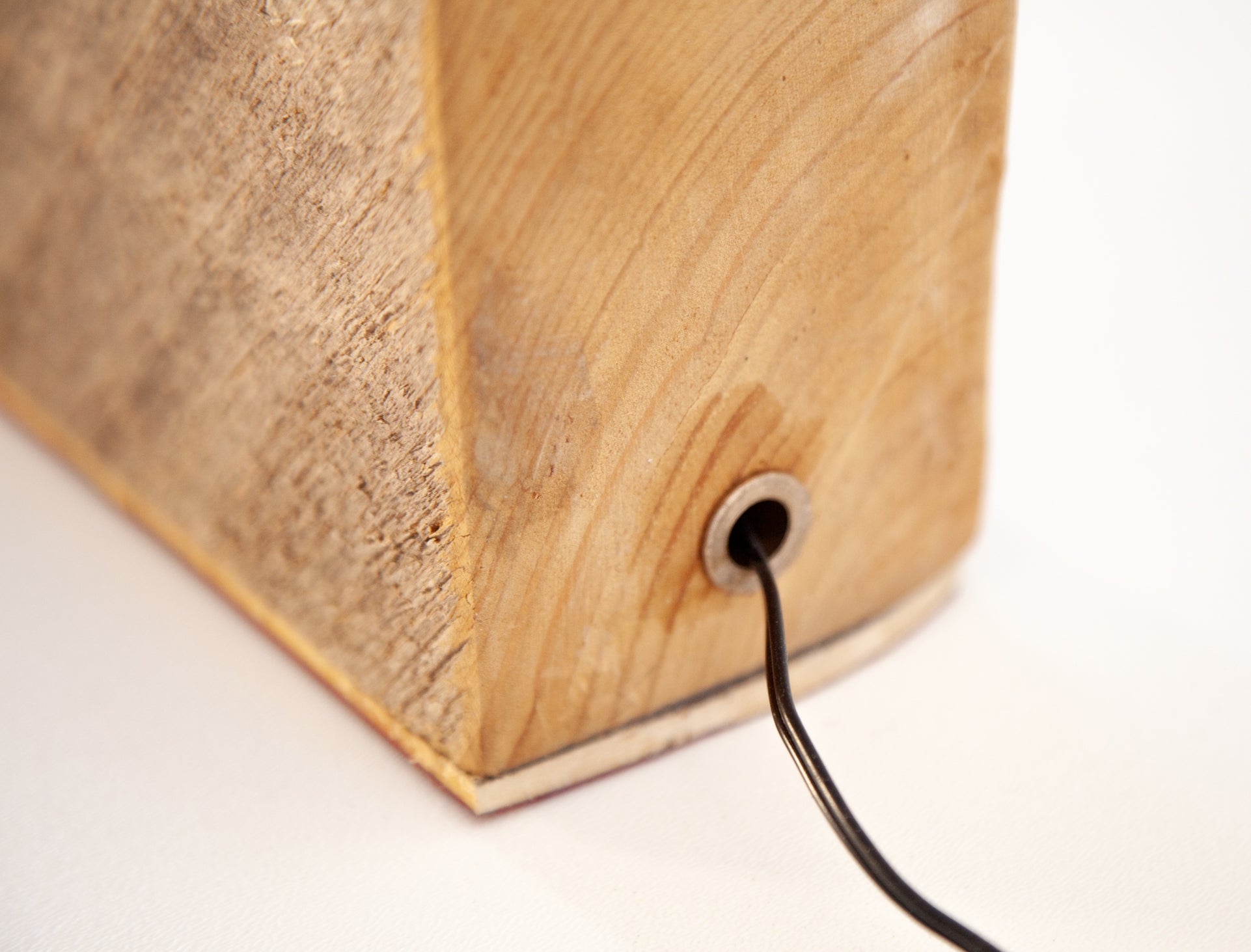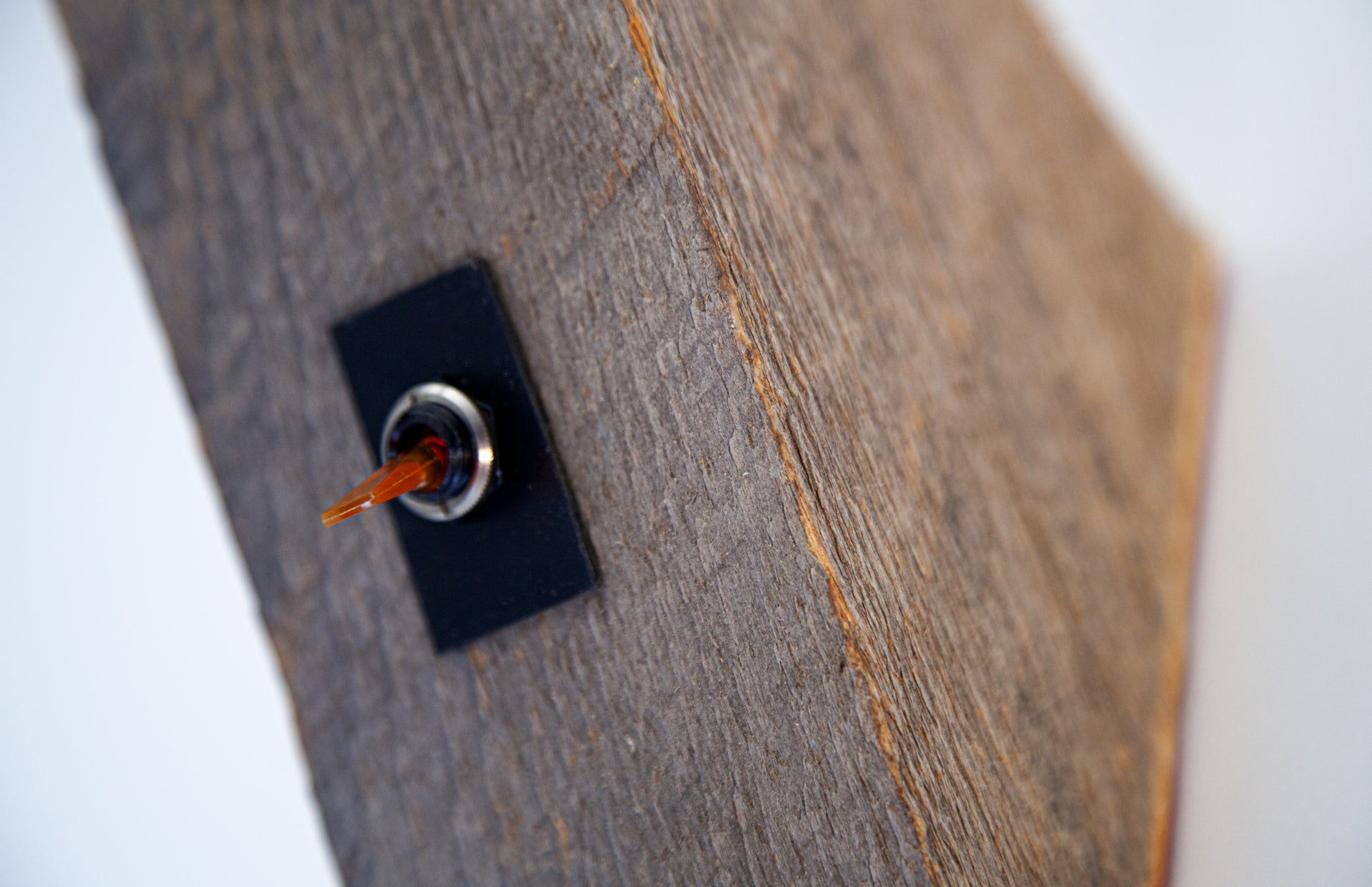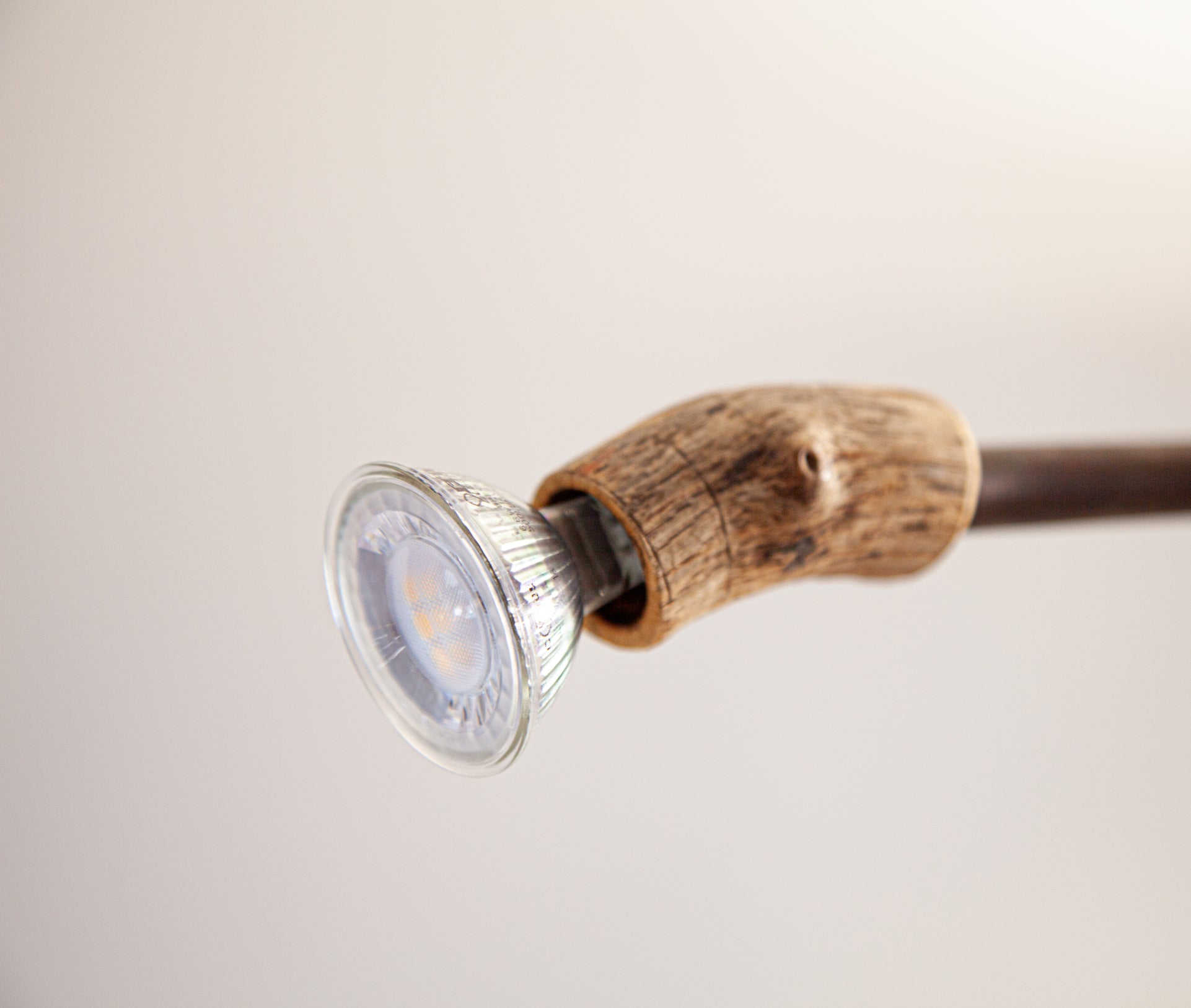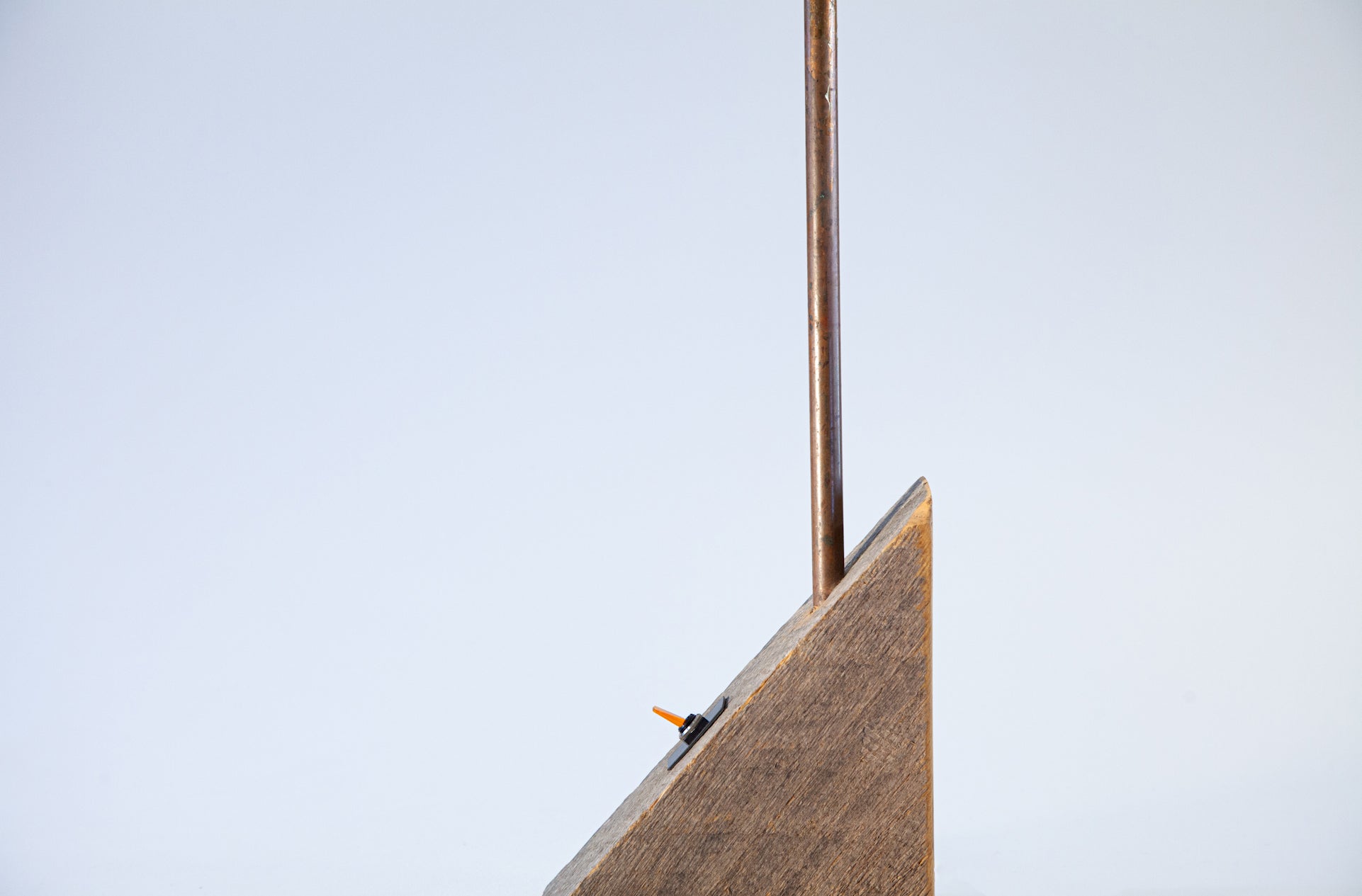 Materials: Reclaimed raw barn beam, oxidized copper pipe, carved wood, incandescent bulb